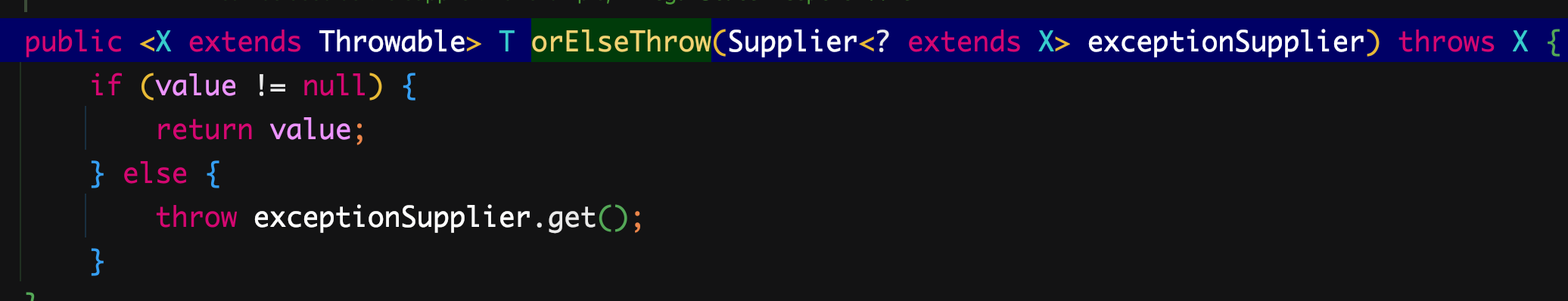 Null 체크에 유용한 Optional 을 사용할 때 많이 보이는 패턴입니다. 이렇게 () -> 식의 코드를 사용하는 경우인데요, 이 orElseThrow의 경우 아래와 같이 Supplier 라는 인터페이스를 받고 있습니다.
