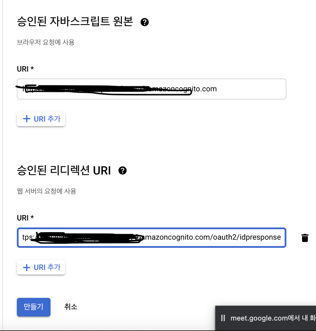 승인된 자바스크립트 원본에는 위에 생성된 Amazon Cognito 도메인 명을 그대로 입력해주도록 합니다.