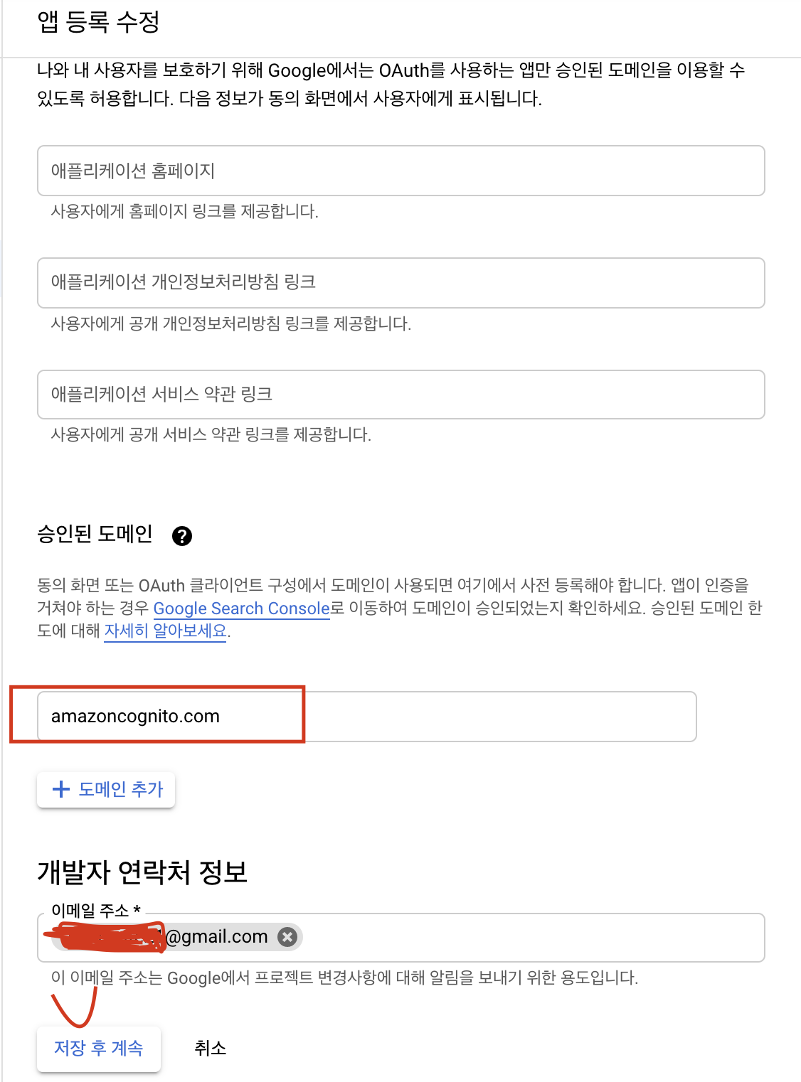 이때, 승인된 도메인은 우리가 사용할 cognito 도메인을 입력해주시면 됩니다. 개발자 연락처 정보는 알림을 위해 작성하는 것이기 때문에 알림을 따로 받을 이메일 계정을 적고 저장 후 계속을 누릅니다.