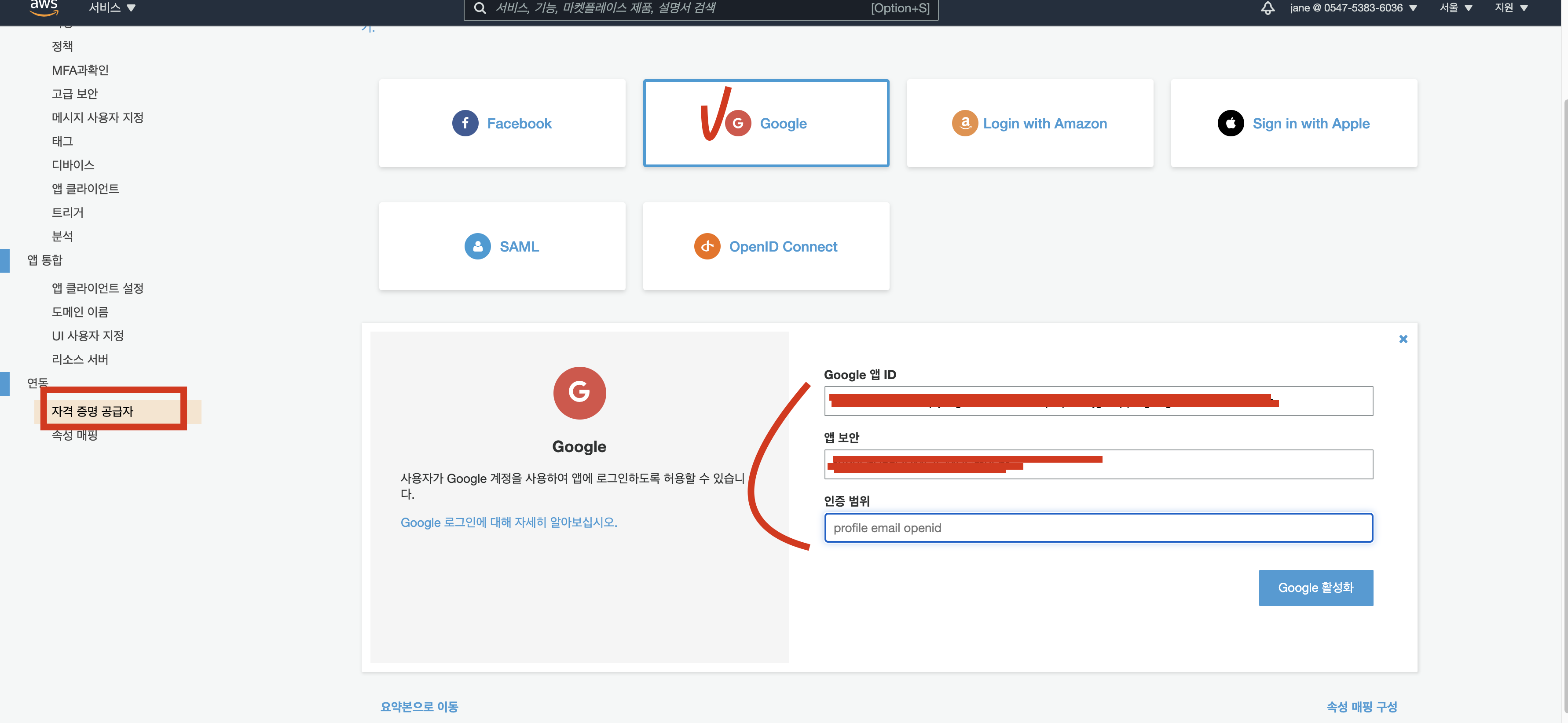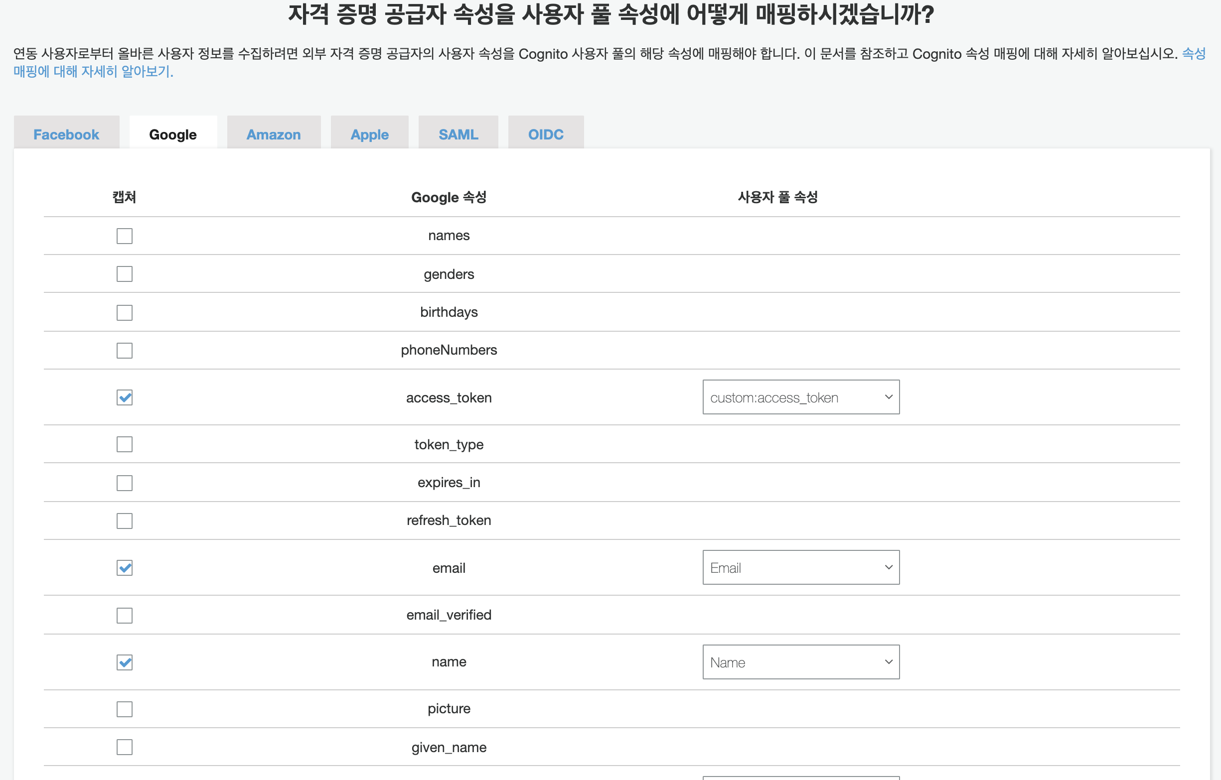 그럼 이런 창이 하나 뜨게 되는데요, Google 탭 클릭 후, 필요한 속성들을 클릭해주도록 합니다. 여기서 사용자 풀 속성도 동일하게 선택을 해주어야 합니다.