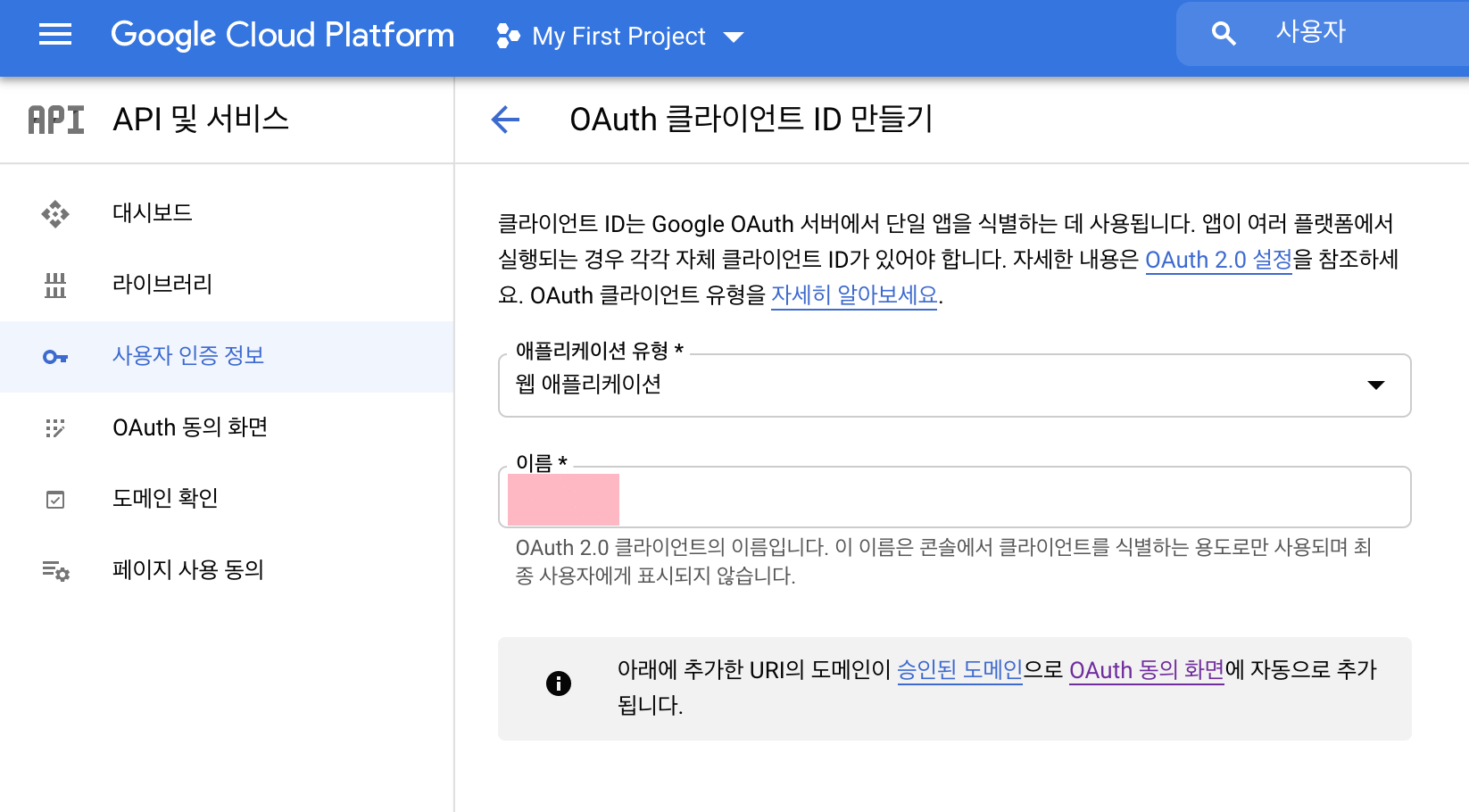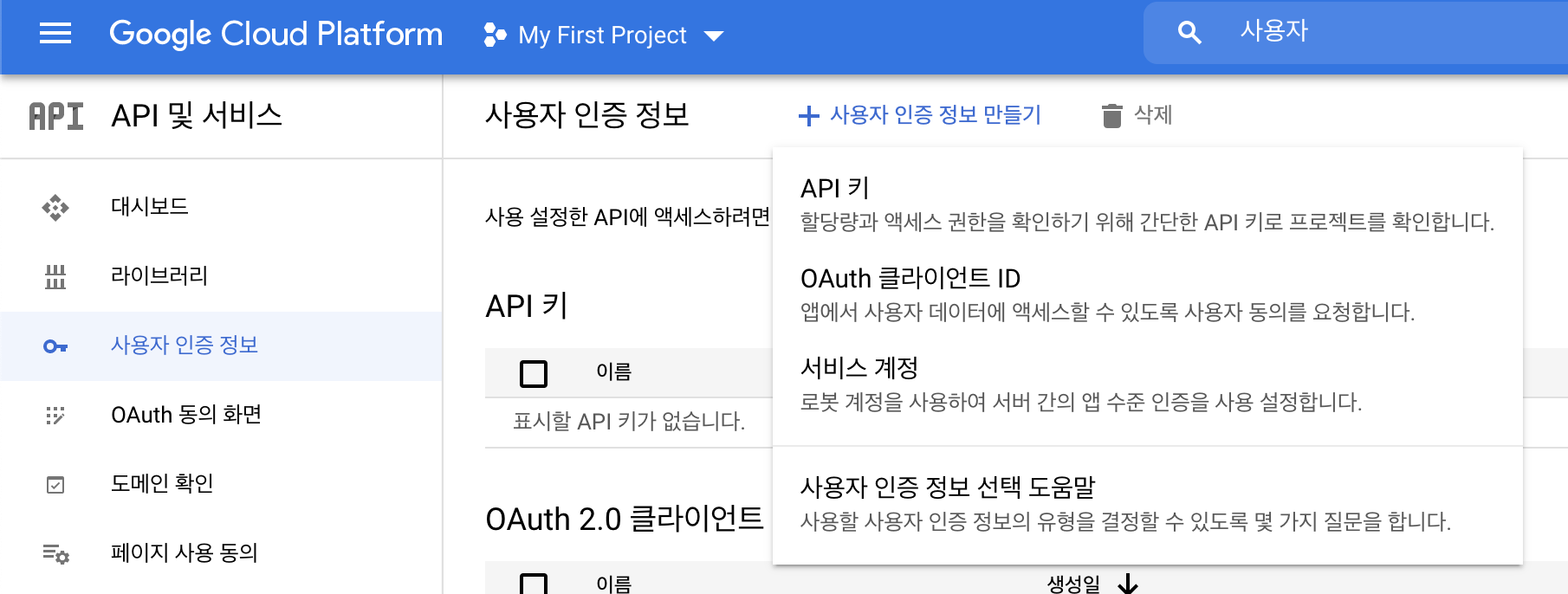 Google cloud platform -> API 및 서비스 -> 사용자 인증 정보 -> 사용자 인증정보 만들기 -> OAuth 클라이언트 ID를 클릭해주세요