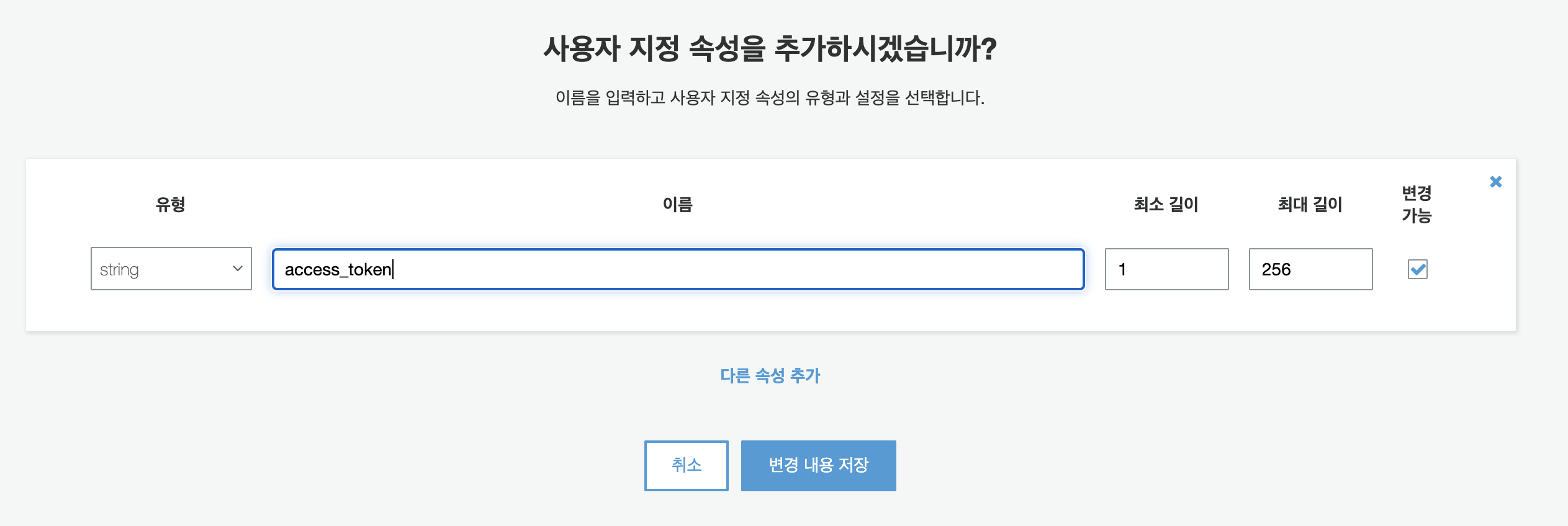 그리고 그 밑으로 쭉 내려보면 사용자지정 속성을 추가할 수 있는데요, 저는 프로젝트에서 access_token(Bearer)이 필요하기 때문에 이 토큰을 따로 받기 위해 속성을 하나 이렇게 추가해주었습니다.
