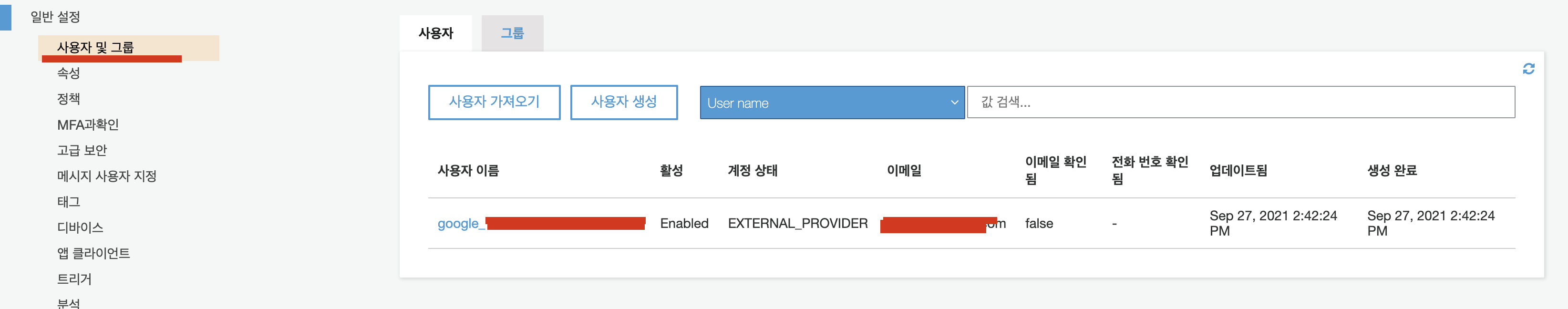 소셜로그인에 성공했다면 우리가 만든 user pool에 테스트 해본 계정의 정보가 뜨게 됩니다. 여기까지 뜬다면 Cognito Google 소셜로그인 연동에 성공한 것입니다!!! (짝짝짝짝)