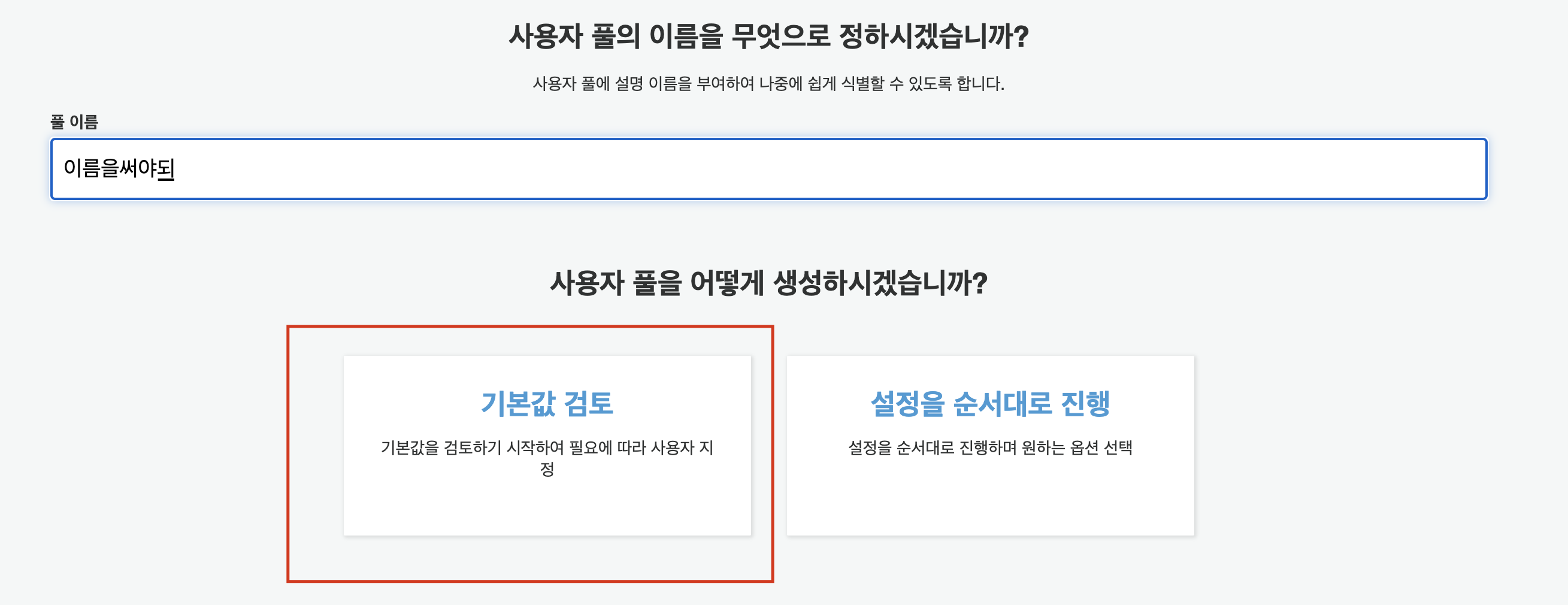 풀 이름(한글명은 안됩니다ㅠㅠ 영어로)을 설정해주고 기본값 검토를 클릭해주세요(일부분을 커스텀하게 할 수 있는 기능인데, 기본값으로도 부족함 없이 설정이 가능합니다)