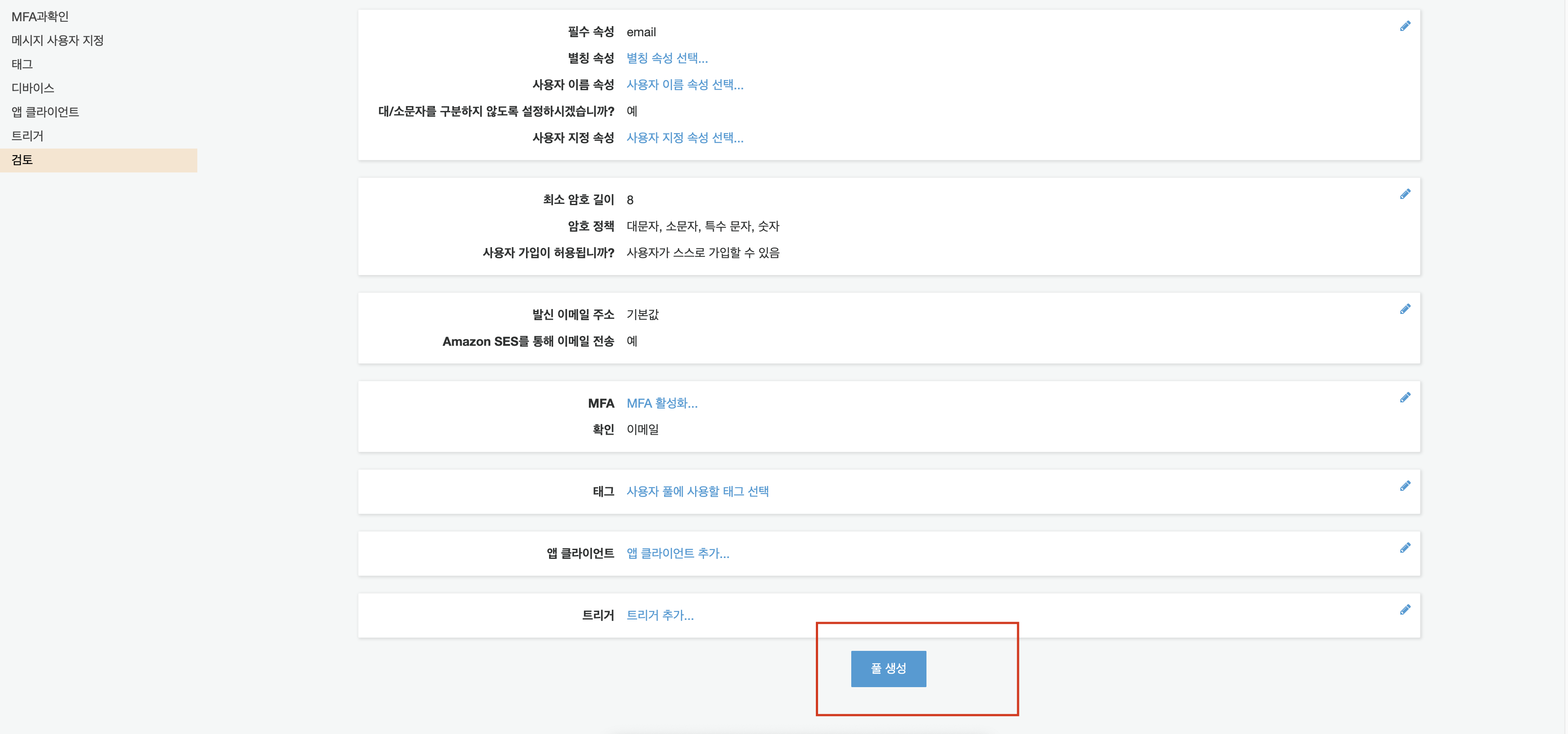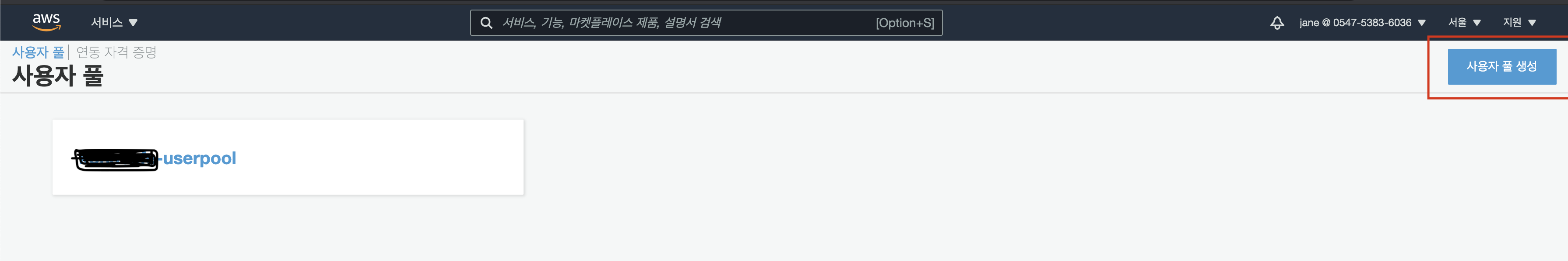 저는 이미 user pool이 생성되어 이렇게 뜨지만 처음에는 아무것도 없으니 오른쪽 위에 사용자 풀 관리를 눌러줍니다.