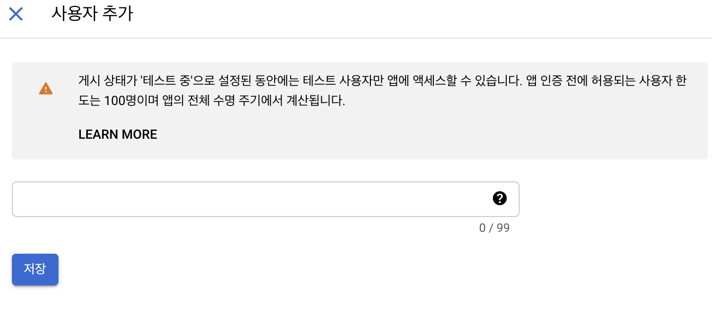 그 다음, 테스트 사용자를 추가해야하는데요, 위의 설명과 같이 테스트 중일 때 어떤 사용자만 액세스 가능하게 할거냐 라는 내용입니다. 저는 아직 정해둔 것이 없어 임의로 ~~tester 식으로만 넣어주었습니다.