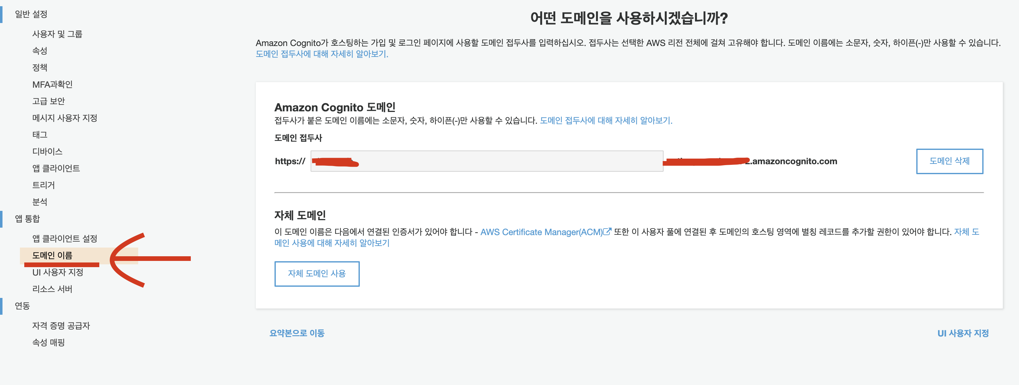 위의 URL에서 내가 지정해준 도메인명(Amazon Cognito 도메인이름 적으면 됨), 앱 클라이언트 ID, 콜백 URL을 입력해주도록 합니다.