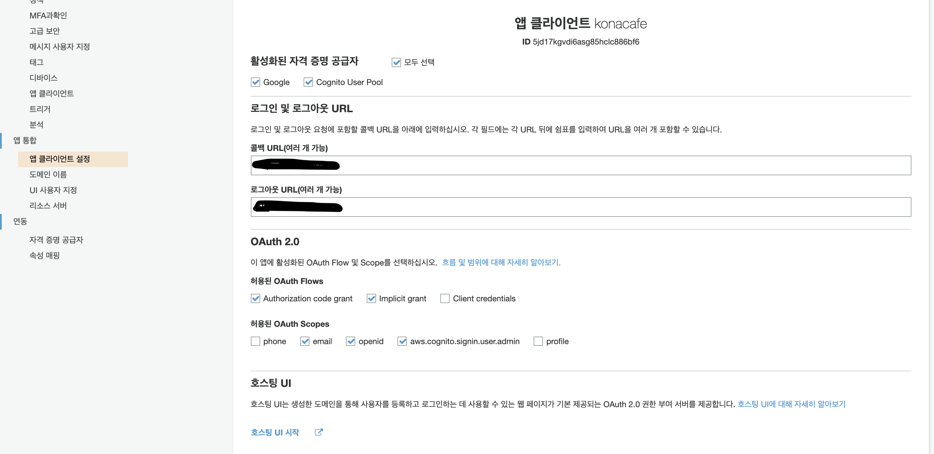 그 다음, 앱 클라이언트 설정에 들어가서 하나 더 설정을 해주어야 합니다. 위의 콜백 URL, 로그아웃 URL은 아직 서비스가 배포되기 전이기 때문에 저는 임시로 동작하지 않는 URL을 입력해주었습니다. 실제로 로그인/로그아웃 시 콜백할 URL을 나중에 입력해주시면 됩니다.